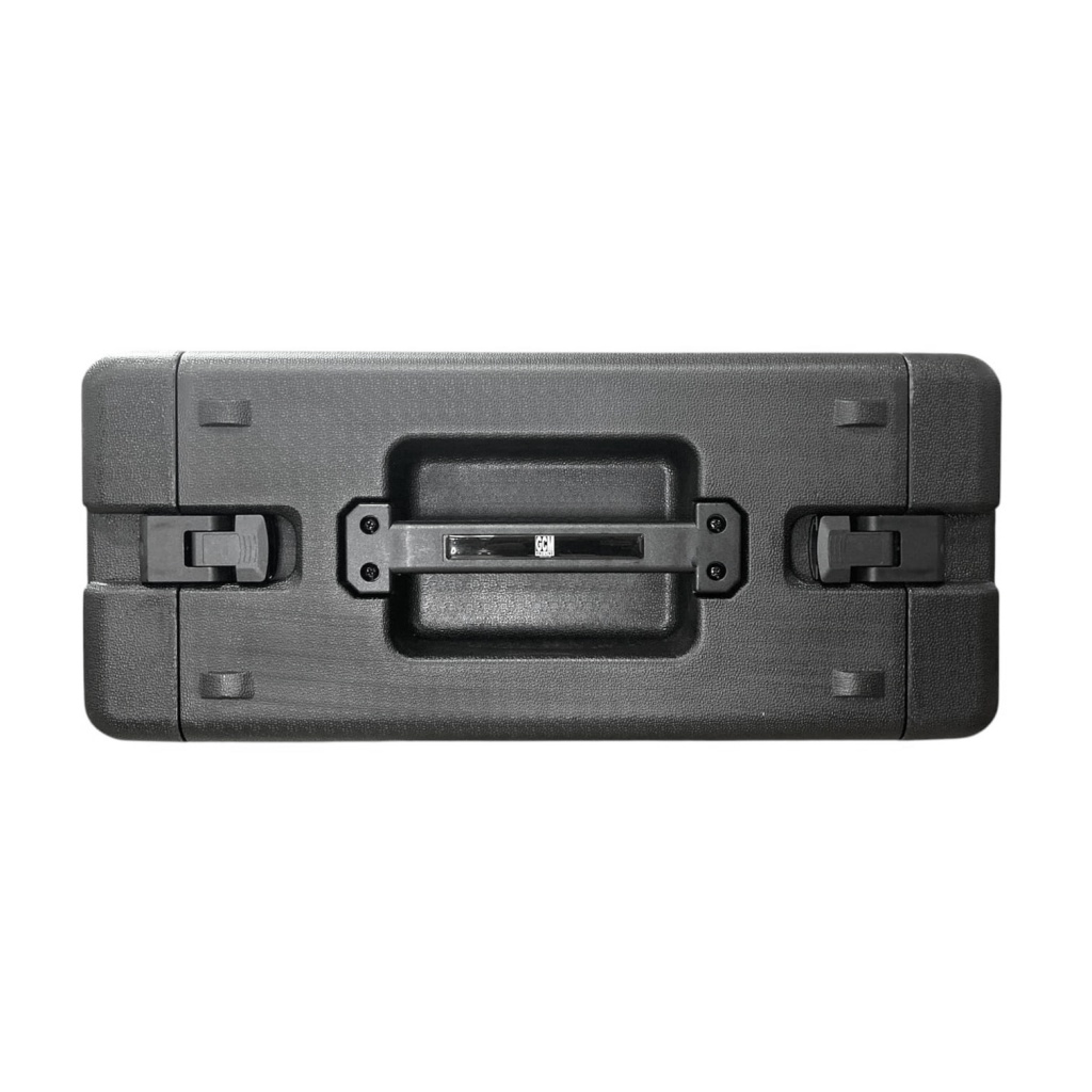 Cuenta con sistema de cierre seguro tipo mariposa que permite abrir y cerrar el rack de forma rápida y confiable. Las manijas laterales integradas facilitan el transporte y manipulación del equipo incluso en entornos exigentes como escenarios, giras o instalaciones profesionales.