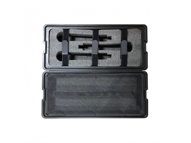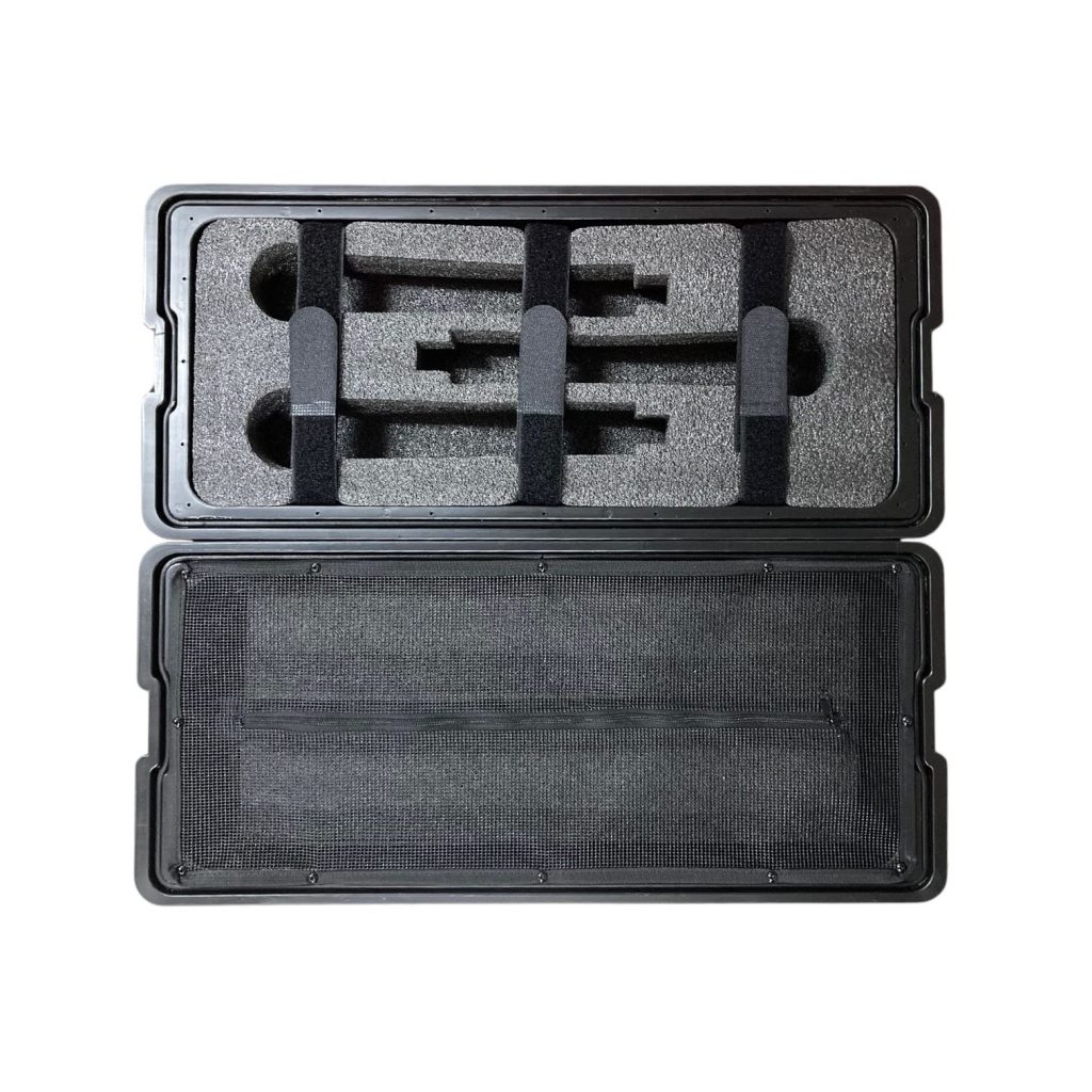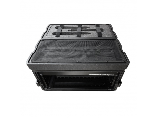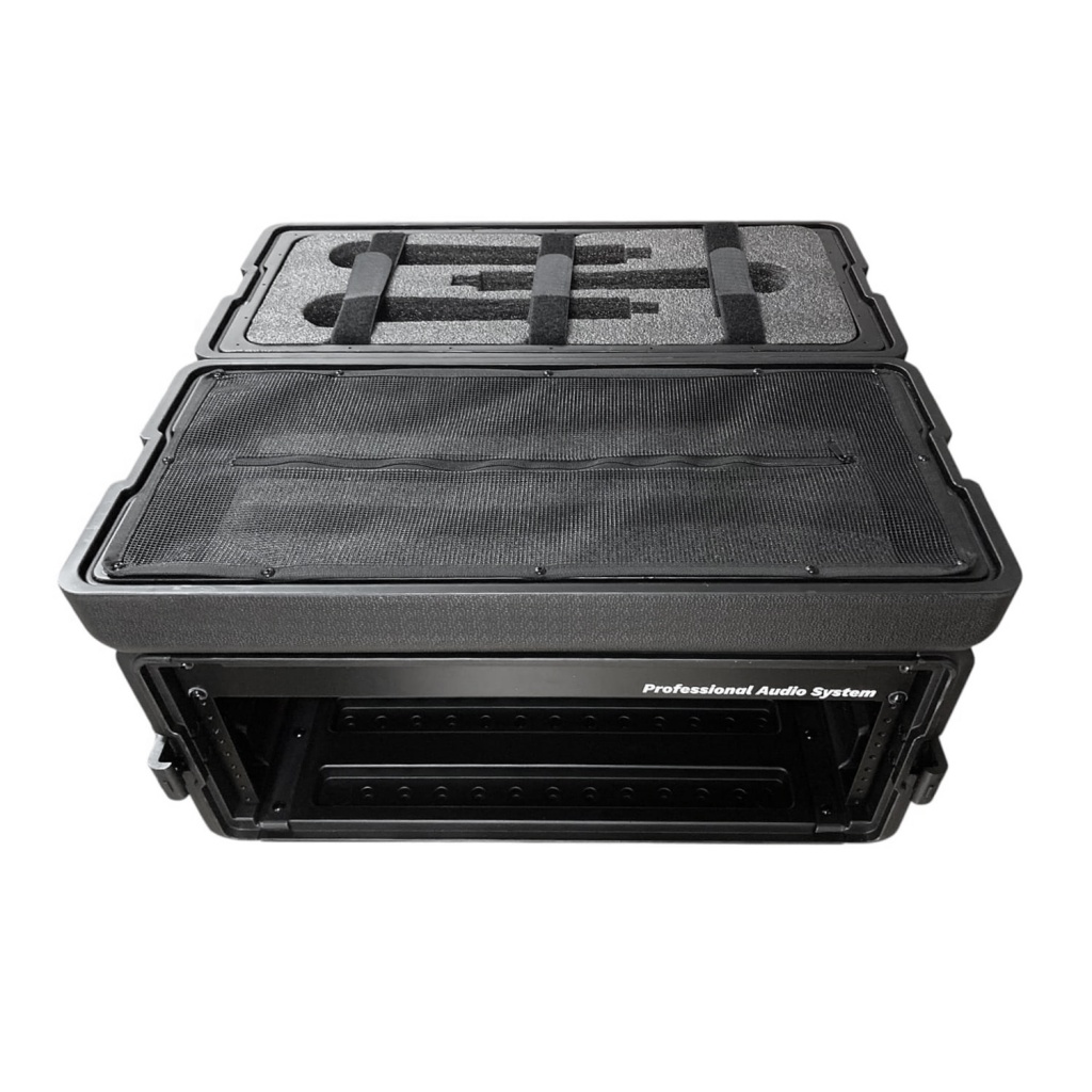 El interior está diseñado para mantener el equipo firmemente instalado, permitiendo una organización eficiente del sistema de audio. Su tamaño compacto facilita el transporte sin sacrificar capacidad de montaje.