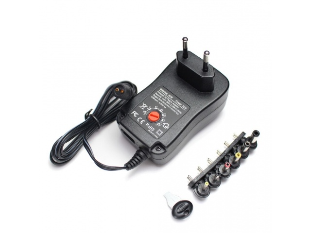 Adaptador de corriente universal con voltaje regulable y múltiples conectores intercambiables. Ideal para alimentar una amplia variedad de dispositivos electrónicos como routers, parlantes, cámaras, juguetes y equipos pequeños. Cuenta con selector de voltaje y certificaciones de seguridad internacionales.