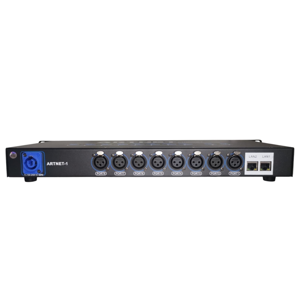 Interfaz profesional Art-Net a DMX diseñada para sistemas de iluminación escénica y arquitectónica. Permite convertir señales Art-Net a DMX512 de forma estable y confiable, integrándose fácilmente en redes Ethernet. Incorpora pantalla LCD frontal para configuración directa del dispositivo sin necesidad de software externo.
